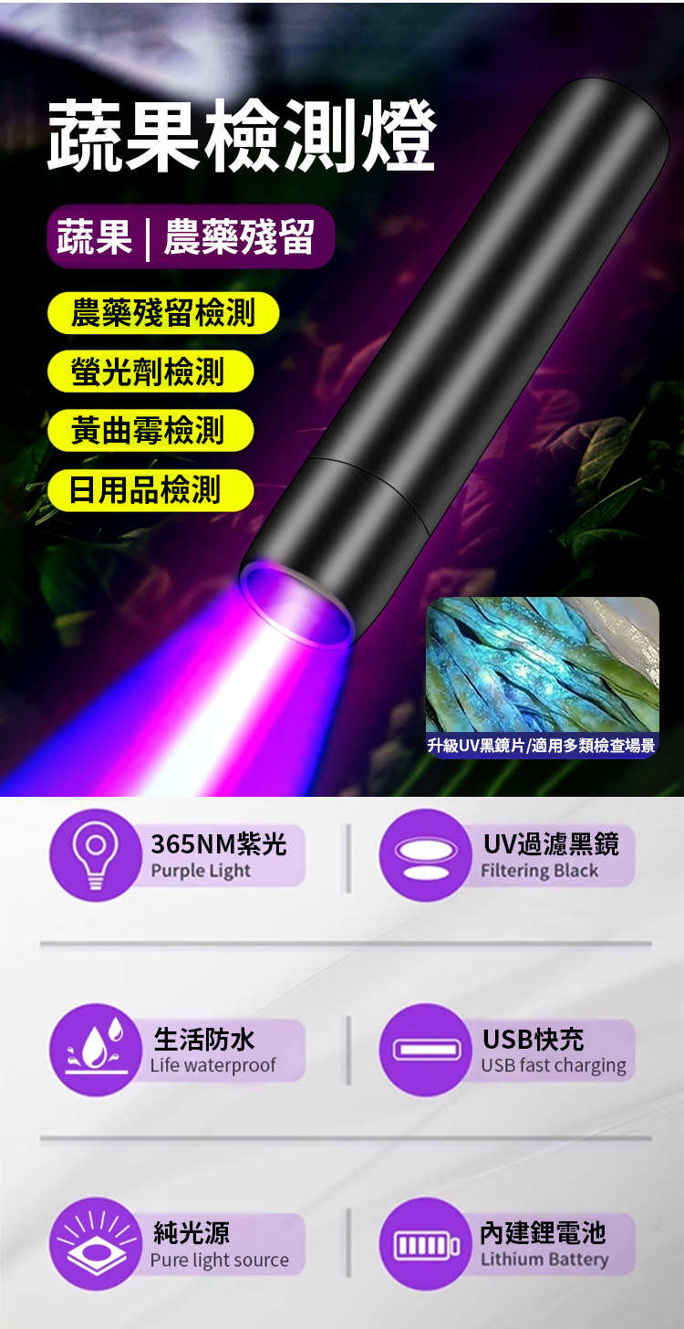 多功能農殘真菌檢測紫光燈,一照現形,比普通紫光燈靈敏5倍!