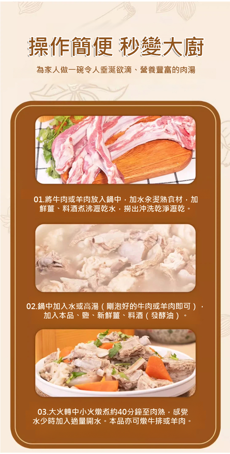 婆婆說這味道讓她想起老家巷口的羊肉湯!秋冬一碗牛肉湯,勝過3件厚衣裳!獨門秘方,精準配比,先去腥膻,再提鮮美,後增層次,保留營養。完美釋放肉質鮮甜!鮮美直達味蕾。一包搞定所有,新手也能做出大廚的味道~